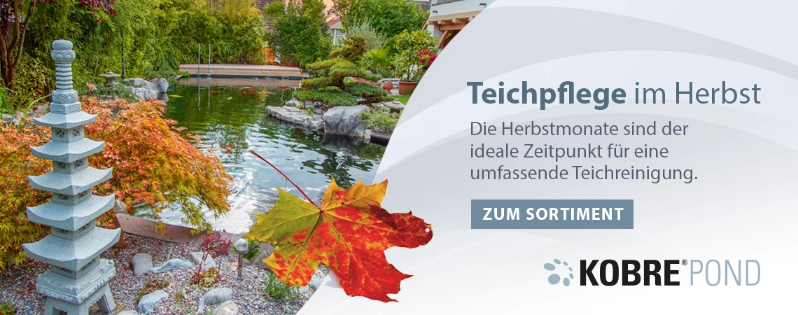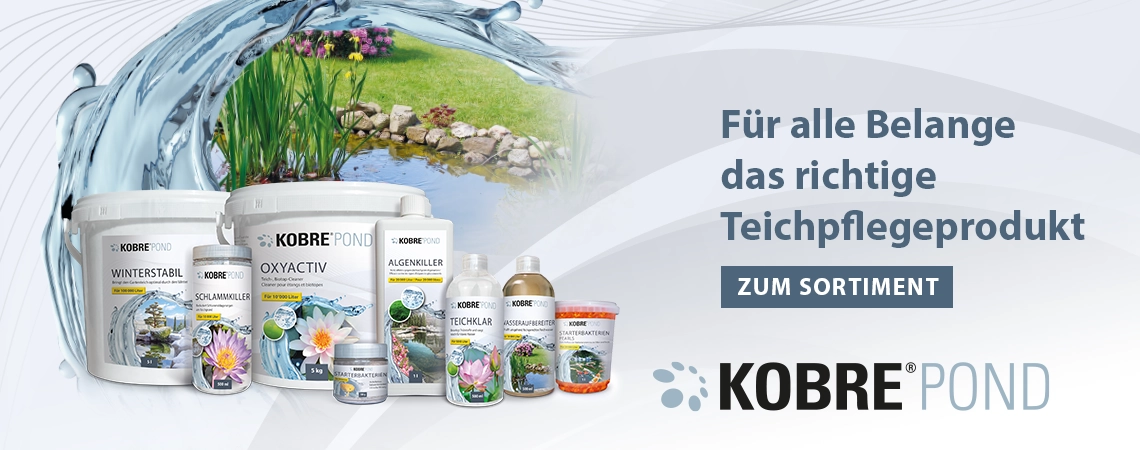 Entdecken Sie jetzt unser Sortiment KOBRE®POND – die effektive Pflegelinie für Ihren Gartenteich. Ob Algenkontrolle, Sauerstoffversorgung oder Winterstabilität: Mit unseren Produkten sorgen Sie ganz einfach für ein natürliches Gleichgewicht im Wasser und ein gesundes Teichklima.