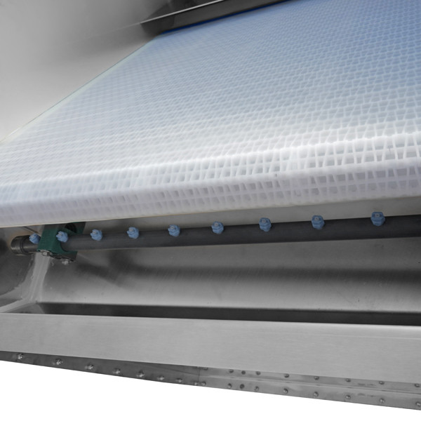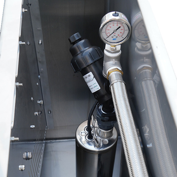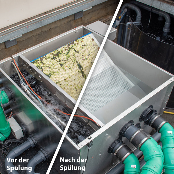 Der Bandspülbereich mit Abwasserrinne befindet sich innerhalb des Filtergehäuse. Die komplette Spülrinne ist frei zugänglich und einsehbar. Sie verfügt über eine transparente Abdeckung, welche die Spülgeräusche auf ein Minimum reduziert. Die im Lieferumfang enthaltene Hochdruckpumpe ist ebenfalls platzsparend in der Biokammer integriert.