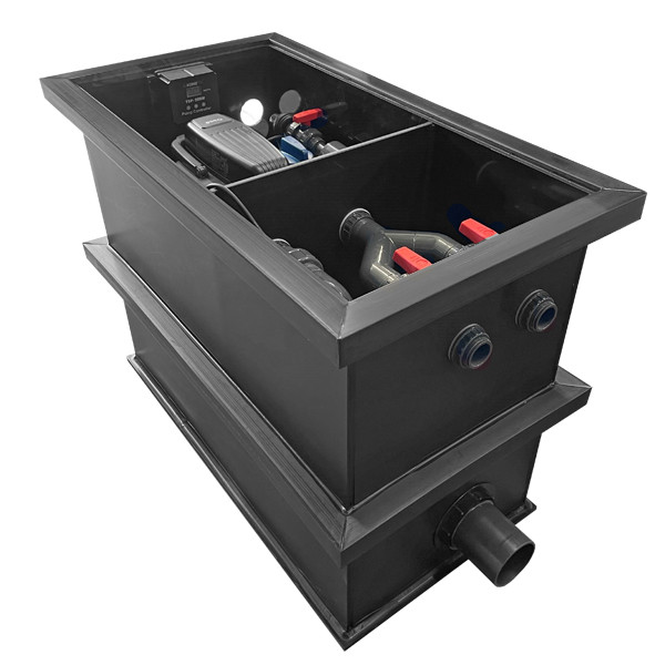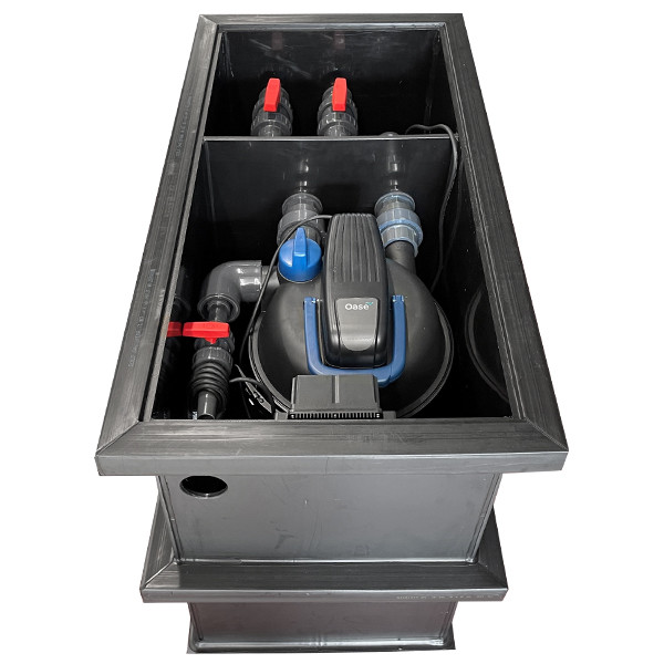 Dieses raffinierte Filtersystem ist komplett vorinstalliert und beinhaltet Filter und Pumpenschacht in einem. Die Inbetriebnahme wird dadurch spielend leicht und rasch ermöglicht. Der Begriff «Plug & Play» könnte treffender nicht sein! Sie sparen Zeit und Geld! Das System ist mit einem stabilem Deckel ausgerüstet und beinhaltet nebst dem Pumpenschacht auch einen Oase Filtoclear 31000 mit Spülleitung, sowie eine integrierte 20000 Liter Kobre®Tec Flow Control Pumpe mit stufenlos regulierbarem Steuergerät. Das Modul (1100x600x810mm) wird einfach im Boden eingegraben und ermöglicht so den Betrieb wie im «Schwerkraftsystem». Bodenablauf und Skimmer können ganz einfach an den dafür vorgesehen Anschlüssen montiert, und über die beiden Zugschieber geregelt werden. Die beiden Rückläufe mit integriertem Kugelhahn ermöglichen es, zusätzlich einen Bachlauf oder Quellstein zu betreiben. Der dadurch erzielte Reinigungseffekt ist enorm!