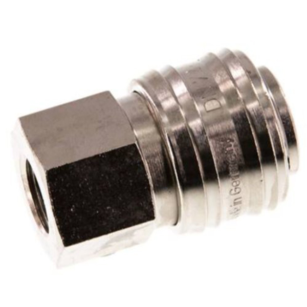 Kupplungsdose mit Innengewinde, G 1/4 Zoll, Messing vernickelt, Nennweite 7,2 mm, mit Bolzenverriegelung, einseitig absperrend.