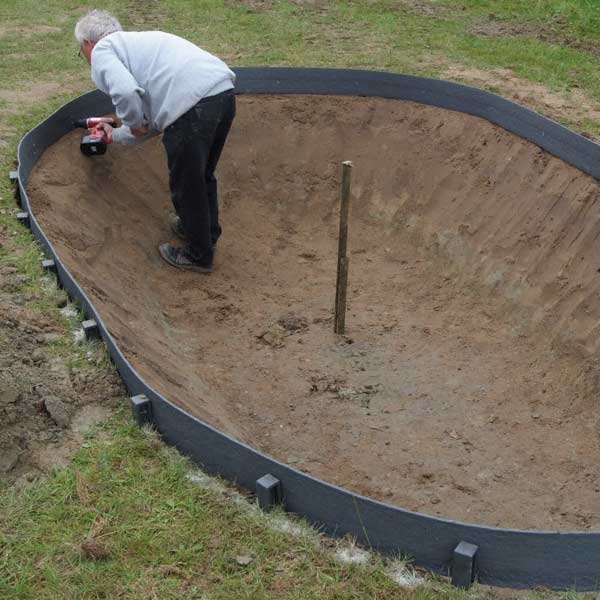 Für einen gleichmässigen Wasserspiegel Mit unserem Teichrandsystem können Sie ganz einfach und im Handumdrehen einen geleichmässigen Teichrand anlegen. Das 14cm hohe Band ist aus Recycling-Kunststoff hergestellt. Es ist flexibel und daher einfach in der Verarbeitung. In Kombination mit den Pfählen lässt sich dadurch eine solide und Trittfeste Unterkonstruktion für einen gleichmässigen Wasserspiegel erstellen. Der Aufbau ist simpel einfach. Zuerst setzten Sie die Pfähle mit einer Wasserwage auf dieselbe Höhe. Der Abstand der Pfähle sollte etwa 50 bis 70 cm betragen. Danach befestigen Sie das Teichrandband mit den rostfreien Inox Schrauben. Bitte beachten Sie auch das Video mit der detaillierten Aufbauanleitung.