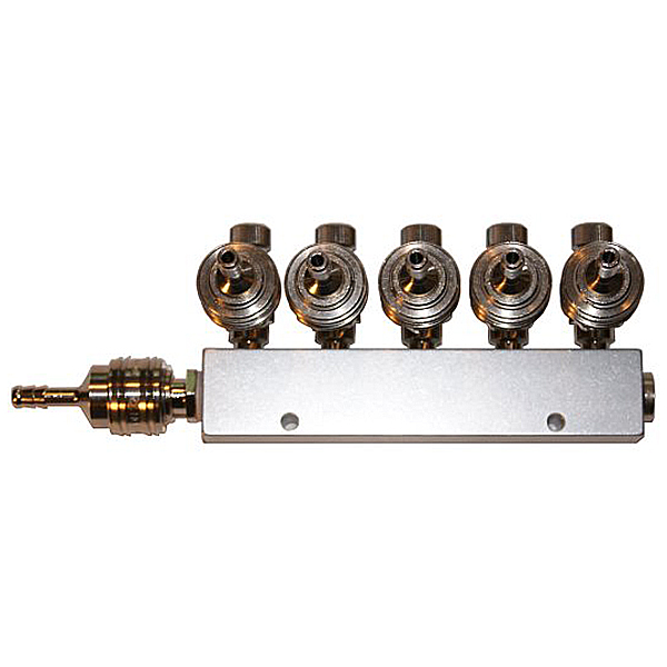 Aluminium Verteilerblock für Sauerstoff. Inklusive Nadelventile und Schnellkupplungen für Sauerstoffschlauch (6 mm Innendurchmesser) Country of origin: Germany